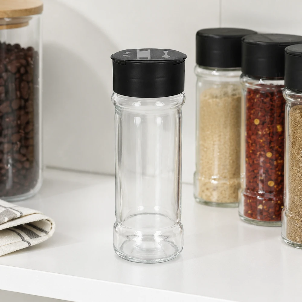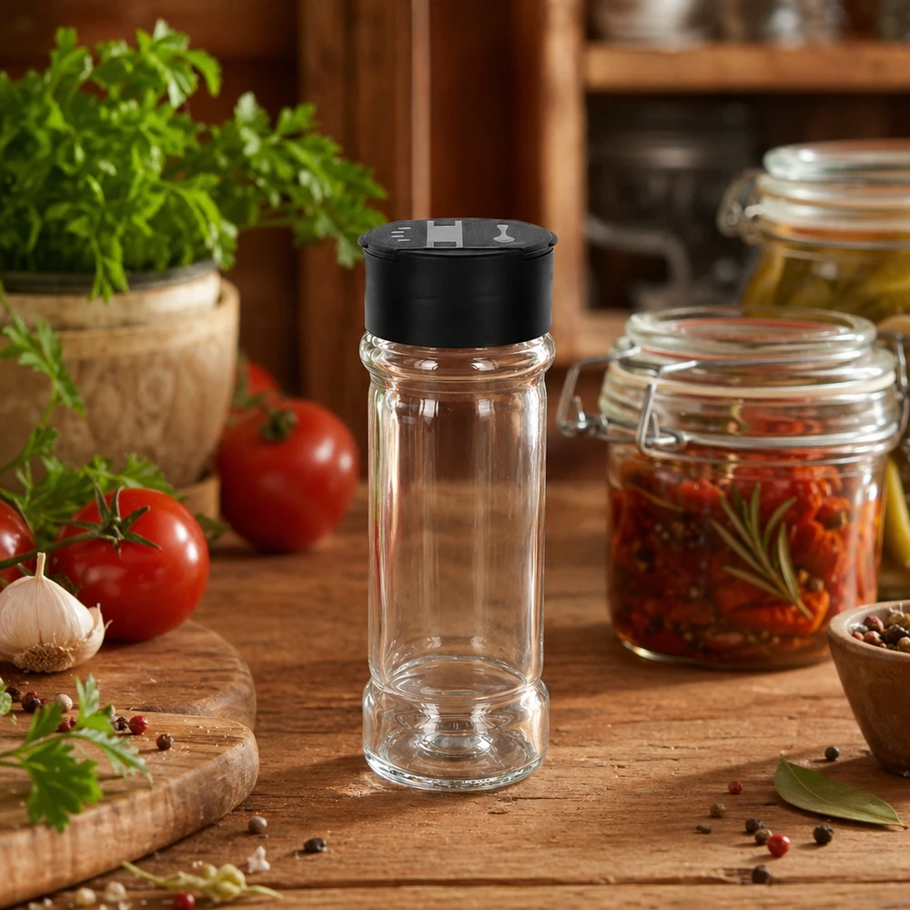 - Omvang levering: Glazen kruidenpotje 'Standaard' 100 ml met 41 ml schroefdraad (1001616), helder glas incl. strooier 'Dual flip-top' van PC zwart (1001618)