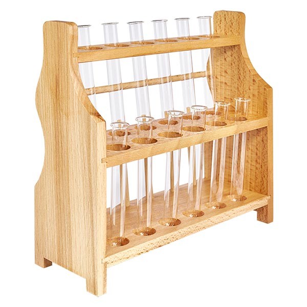 - Omschrijving: Houten reageerbuizenrekje met 12 borosilicaat reageerbuizen 100x12
