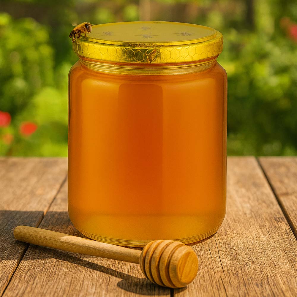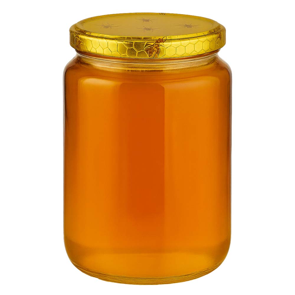 Grote honingpot van 1000 g met een metalen deksel met honingraatmotief BasicSeal UNiTWIST. Perfect voor grote hoeveelheden honing, cadeauverpakkingen en directe verkoop.