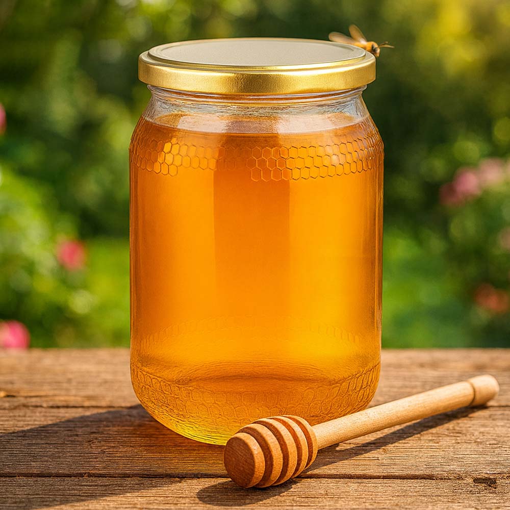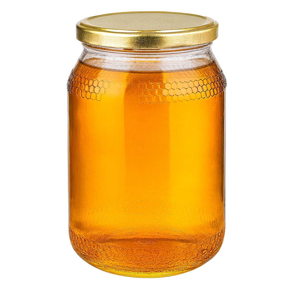 Grote honingpot van 1260 g met een elegant gouden metalen deksel BasicSeal UNiTWIST. Perfect voor familieverpakkingen, grote hoeveelheden en geschenksets.