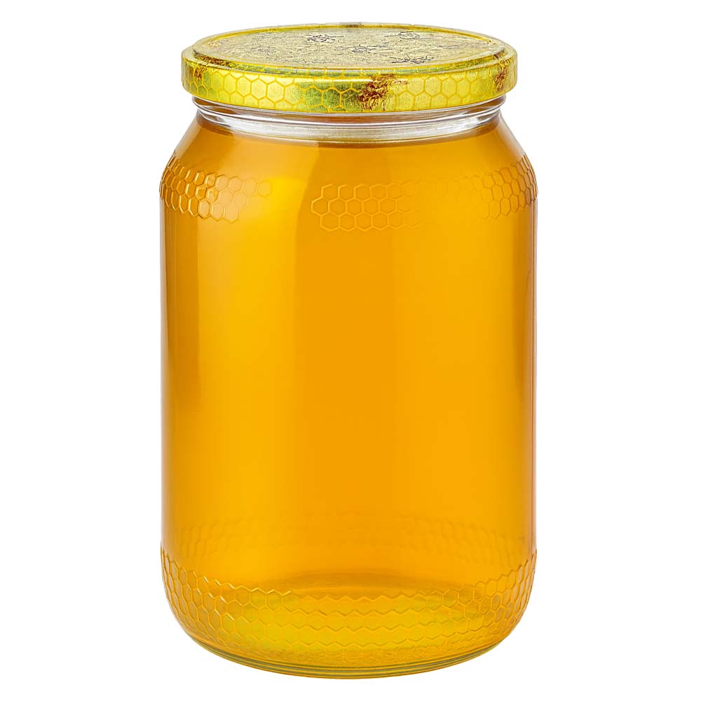 Grote honingpot van 1260 g met een metalen deksel met honingraatmotief BasicSeal UNiTWIST. Het decoratieve ontwerp benadrukt de natuurlijke oorsprong van honing en maakt het glas perfect voor grote hoeveelheden en geschenksets.