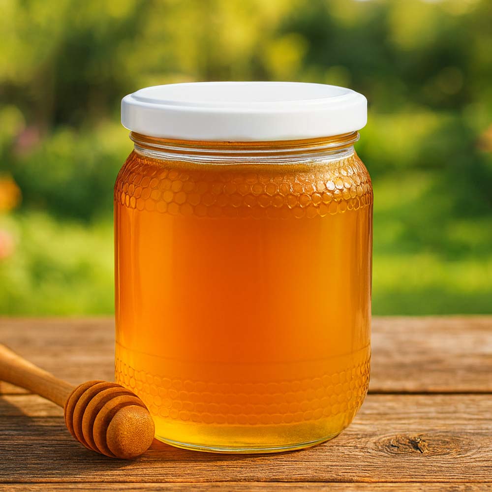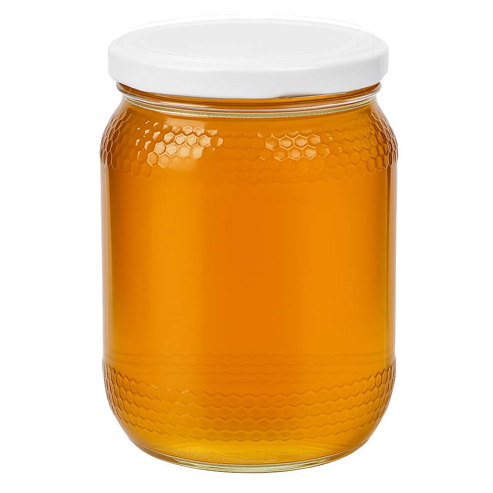 Grote honingpot van 1260 g met een witte metalen BasicSeal UNiTWIST-deksel. Het moderne en strakke ontwerp is ideaal voor verkoop, familieverpakkingen en premiumproductlijnen.