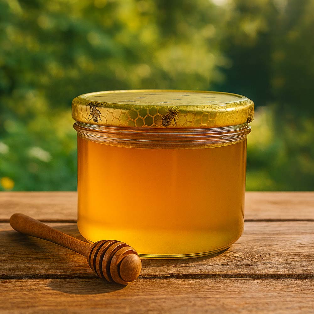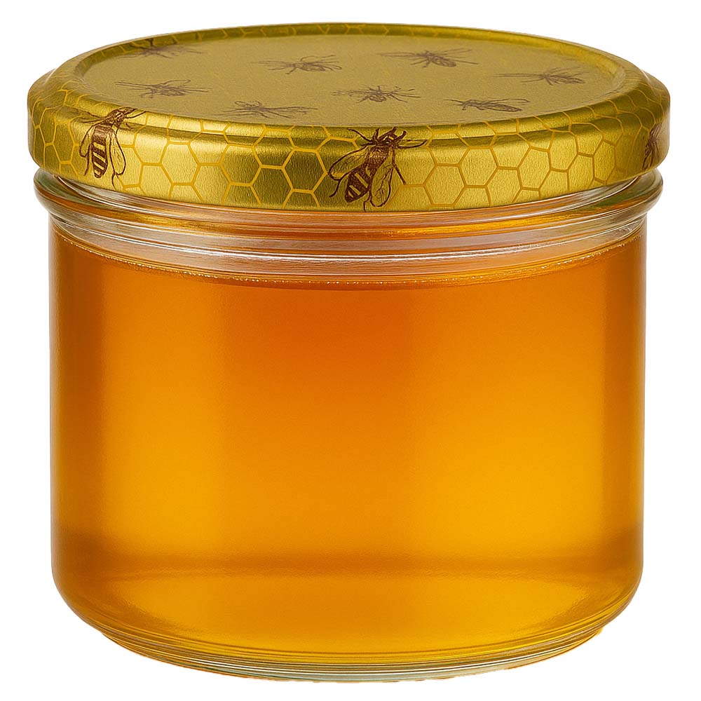 Glazen honingpot van 250 g met een metalen deksel met honingraatmotief BasicSeal UNiTWIST. Het decoratieve deksel benadrukt het natuurlijke karakter van de honing en trekt extra aandacht in het schap.