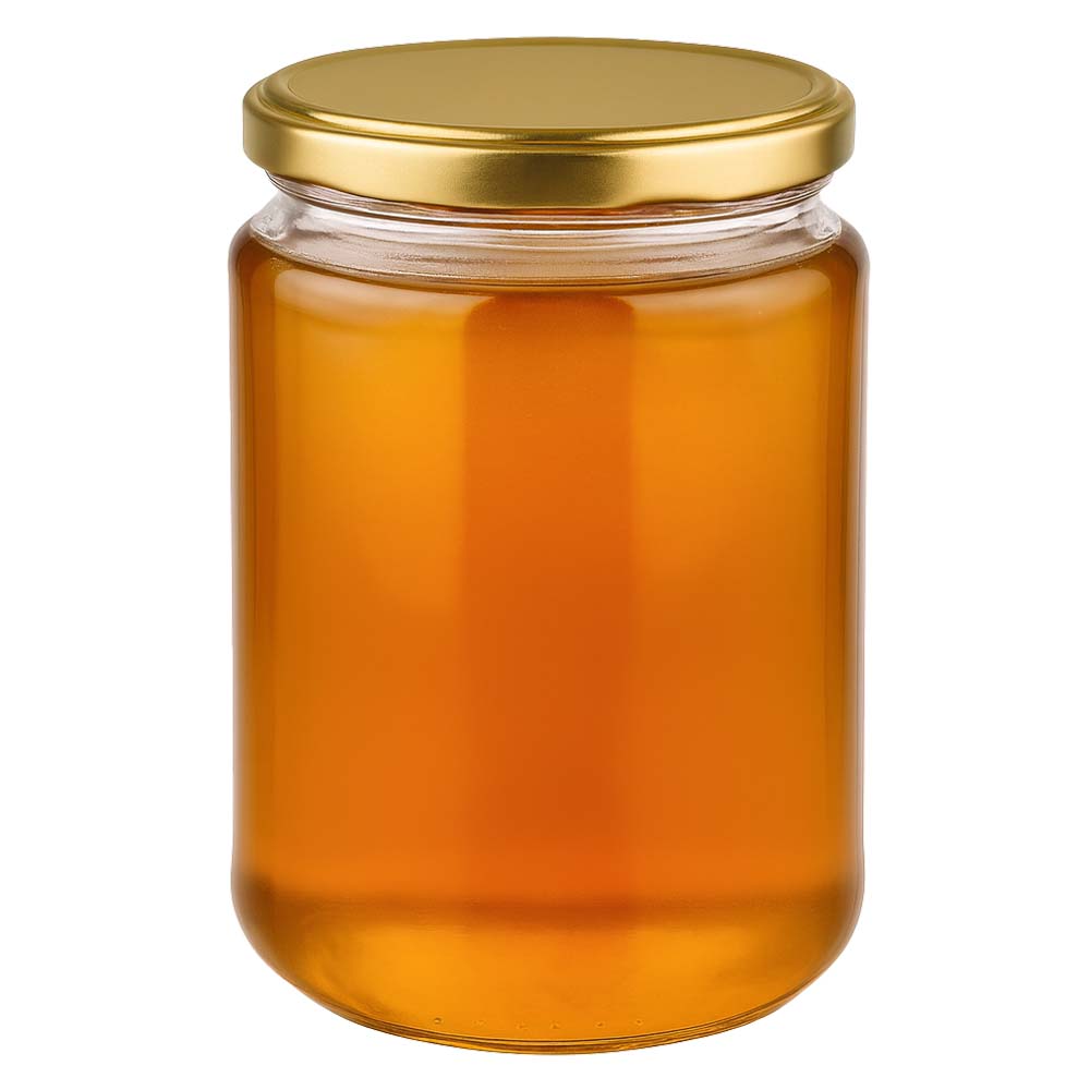 Stevige honingpot van 450 g met een elegant gouden metalen deksel BasicSeal UNiTWIST. Perfect voor grotere porties, verkoop en premium geschenksets.
