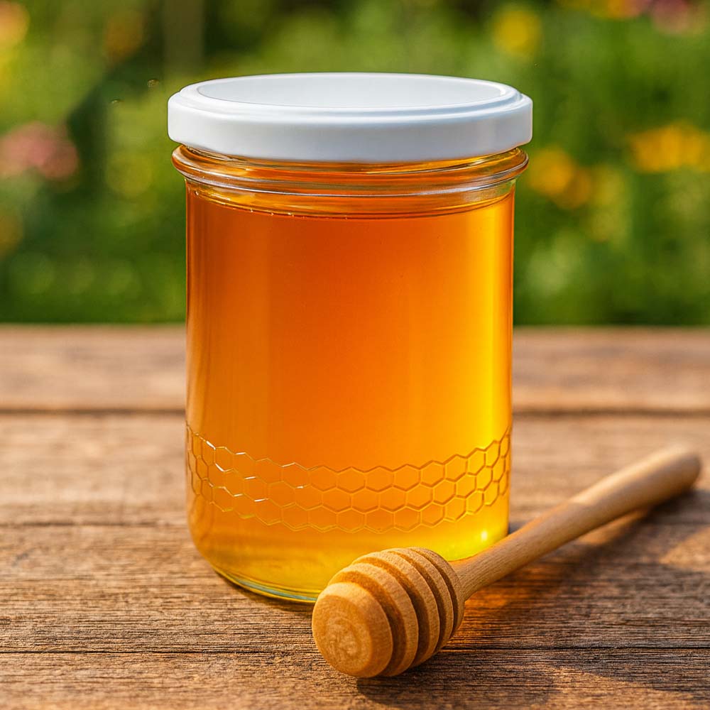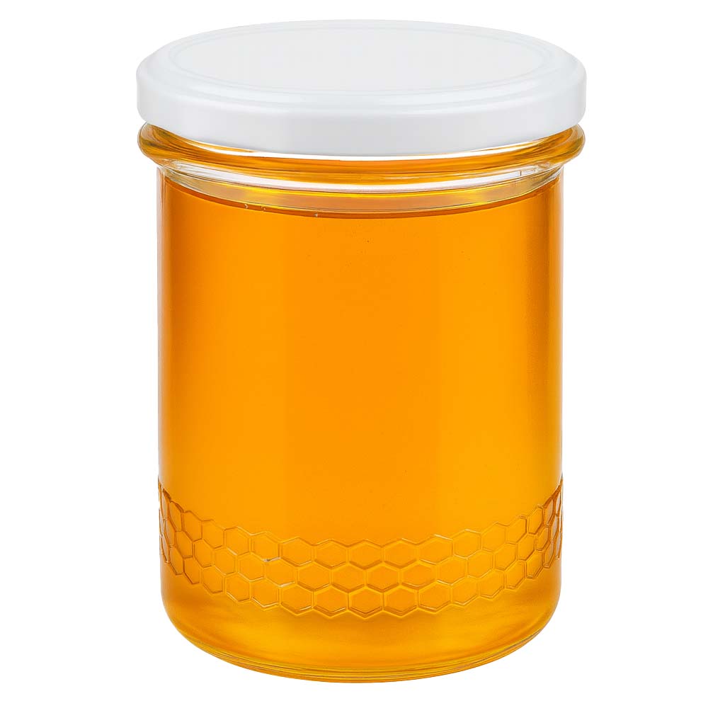 Honingpot van 560 g met een witte metalen BasicSeal UNiTWIST-deksel. Het strakke en moderne ontwerp past perfect bij premium presentaties en directe verkoop.