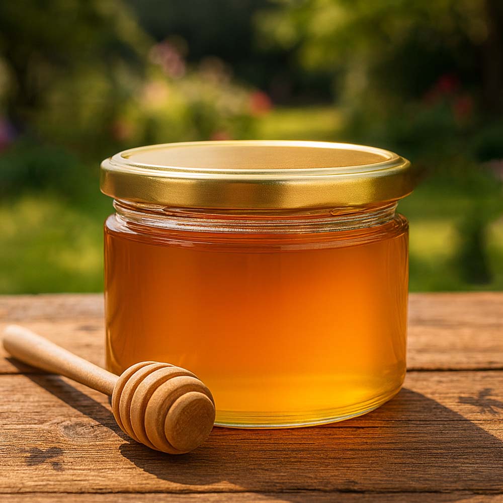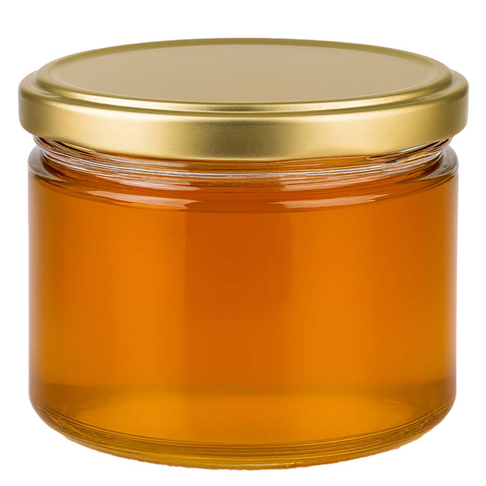 Stevige honingpot van 700 g met een elegant gouden metalen deksel BasicSeal UNiTWIST. Perfect voor grotere hoeveelheden honing, verkoop en geschenkverpakkingen.