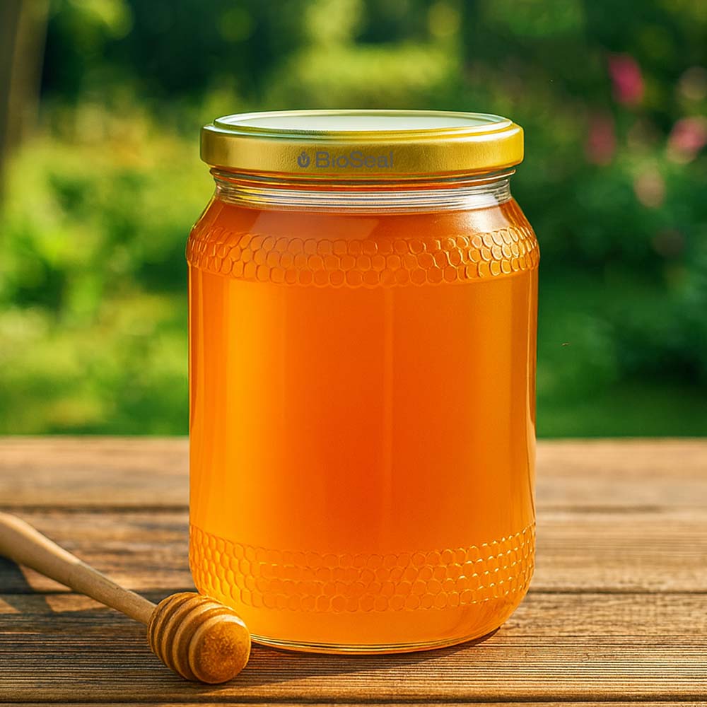 Grote honingpot van 1260 g met een gouden BioSeal UNiTWIST-deksel. Perfect voor grote hoeveelheden honing, luxe presentaties en cadeauverpakkingen.