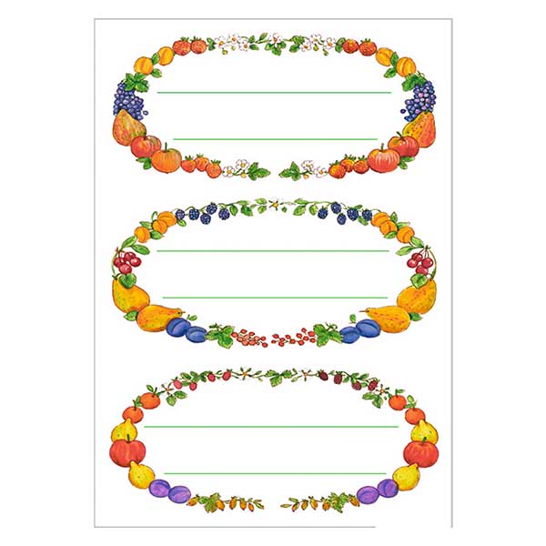Ontwerp: 12 ovale stickers met verschillende fruitsoorten en een tekstveld.