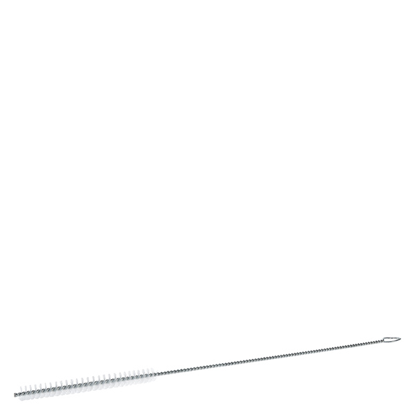 Reinigingsborstel rond maat L met oogje ⌀8mm. Ideaal voor het schoonmaken van pipetten en trechters. Gemaakt van nylon haren. 27cm totale lengte.